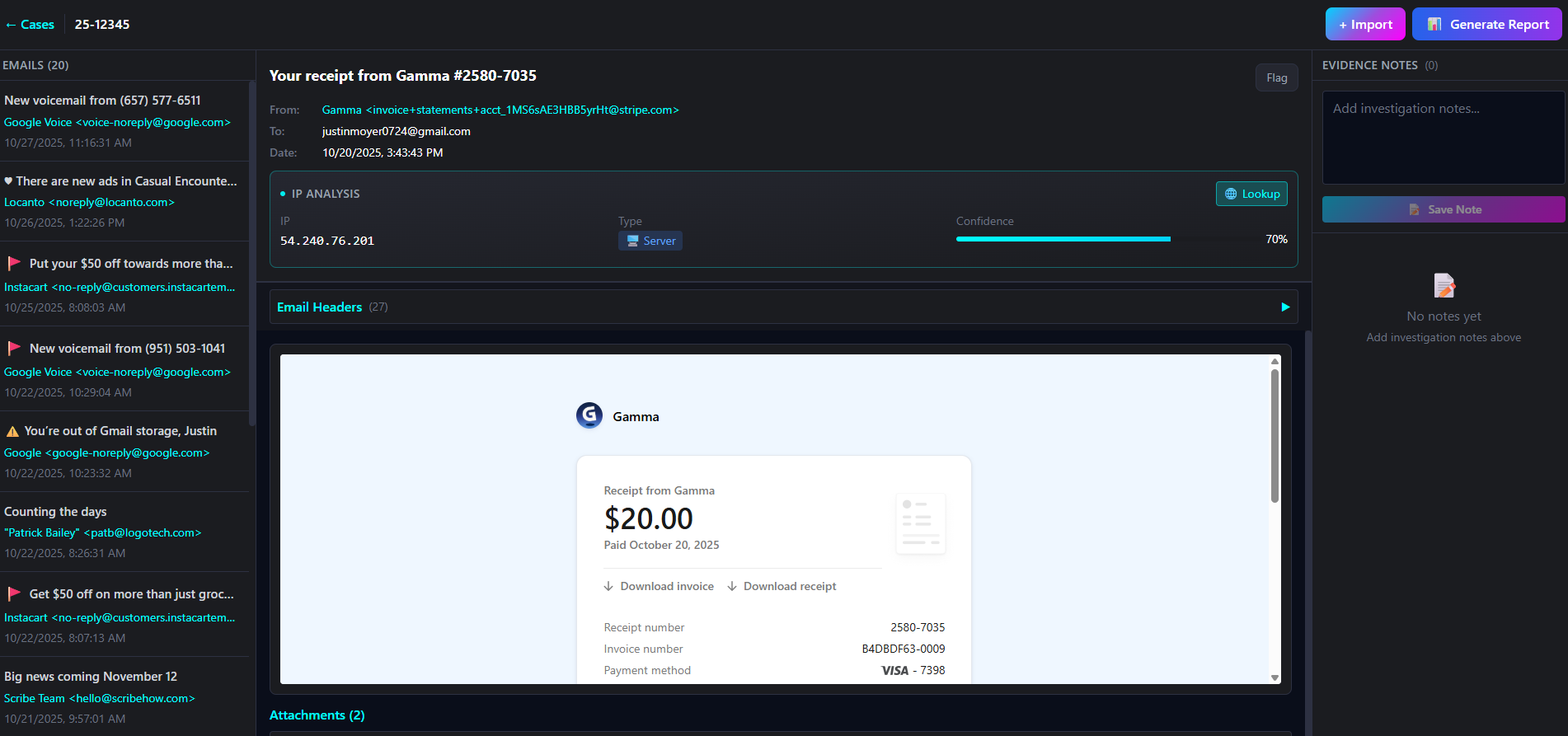 Aperture Investigative Email Parser is the first software tool created by Investigator Network for Law Enforcement. This tool not only allows you to parse and display data from email file formats such as .mbox and .eml but it will also let you flag evidence, make notes, and export to a pdf report for attaching to your criminal reports. Download can be found in the course notes.