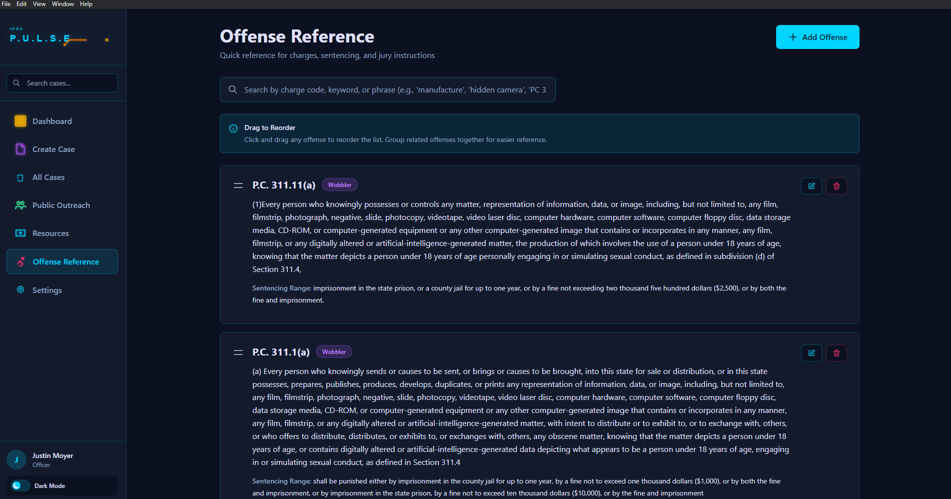 Upload and Edit your jurisdictions CSAM Offenses as an interactive "Go-BY" or "Cheater" as a quick reference guide for your CSAM related cases. Complete with search functionality for ease of locating appropriate charges.